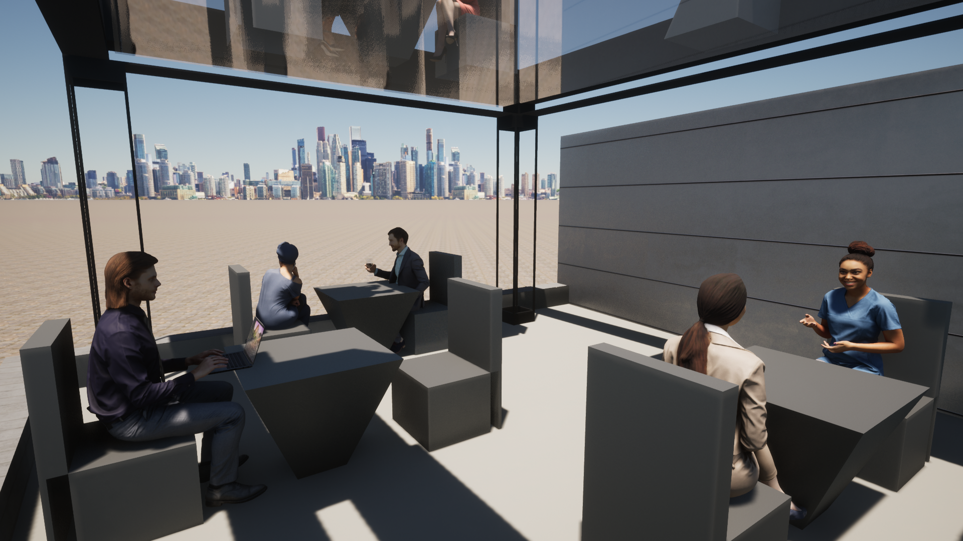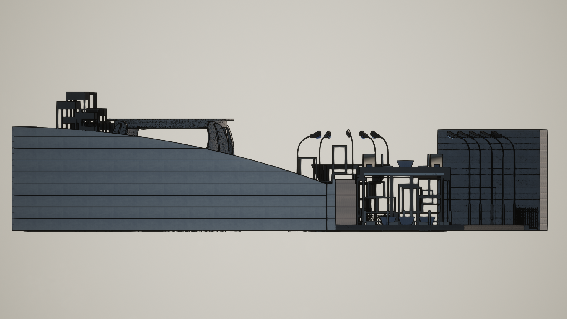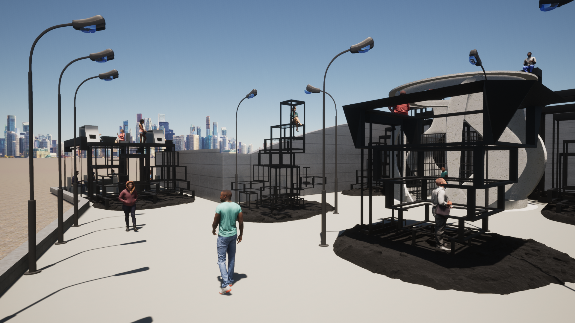 This space was designed to reclaim these urban elements an invite people to activvely engage with them, while still embracing their industrial aesthetic. Everything is built to be interactive -- with towers that are meant to be climbed and social spaces that reside within brutalist structures.